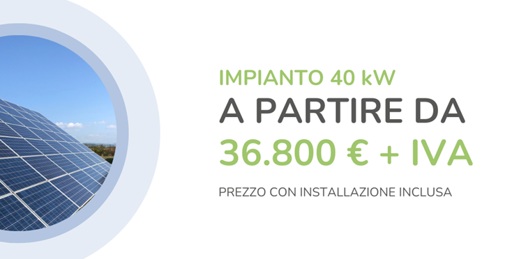 Un impianto fotovoltaico da 40 kW è un sistema di medie dimensioni in grado di sostenere i consumi energetici di piccole-medie aziende e attività commerciali. In questa pagina, ti spieghiamo tutte le sue caratteristiche, i costi, gli incentivi disponibili e il servizio completo che offriamo.